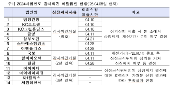 9일 한국거래소가 발표한 ‘유가증권시장 2024 사업연도 12월 결산법인 결산 관련 시장 조치 현황’에 따르면, 사업보고서 제출과 관련해 유가증권시장에서 14개사에 상장폐지 사유가 발생했다.