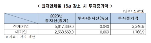 또 최저한세율 인하에 따른 기업투자 확대 효과를 분석한 결과, 최저한세율이 1%p 낮아지면 투자액은 약 2조 2469억 원 증가하는 것으로 나타났다. 대기업 투자 증가액은 약 1조 7689억 원으로 분석됐다.