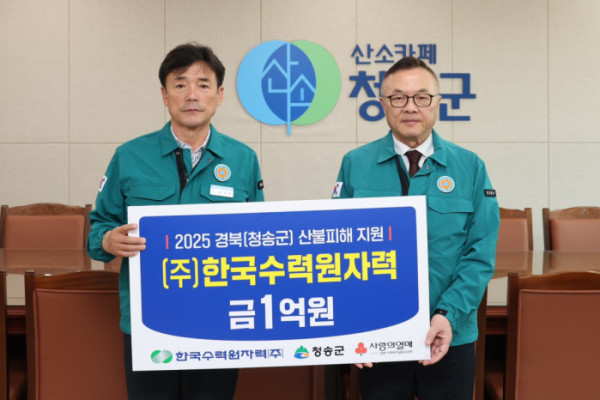 한국수력원자력이 영덕군과 양양군 산불 피해 복구를 위해 성금 2억 원을 전달했다. 한수원이 이번 산불 피해 극복을 위해 전달한 성금은 총 6억 원에 달한다.