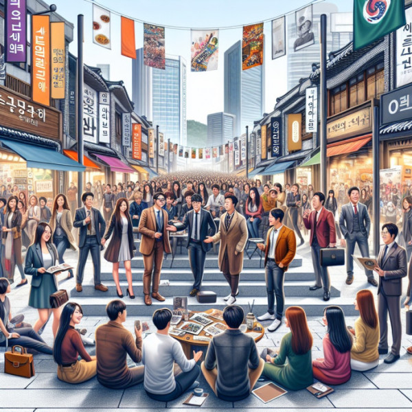 ▲수원에 있는 번화 한 도시 거리를 묘사 한 활기찬 장면으로, 대학생과 상점 주인 간의 협력해 창의적인 마케팅 아이디어와 홍보 활동을 보여주는 이미지. (김재학 기자·오픈AI 달리)