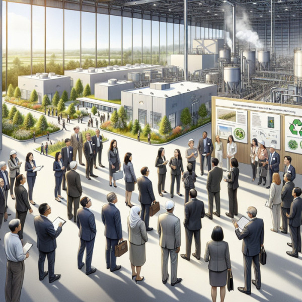 ▲현대 산업 시설을 살펴보는 지역 사회 구성원과 지방 정부 공무원 그룹을 묘사 이미지 (김재학 기자·오픈AI 달리)