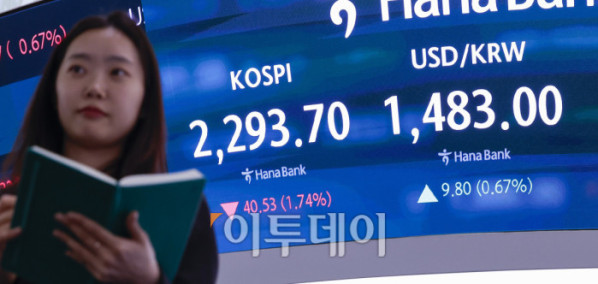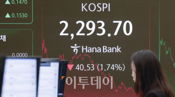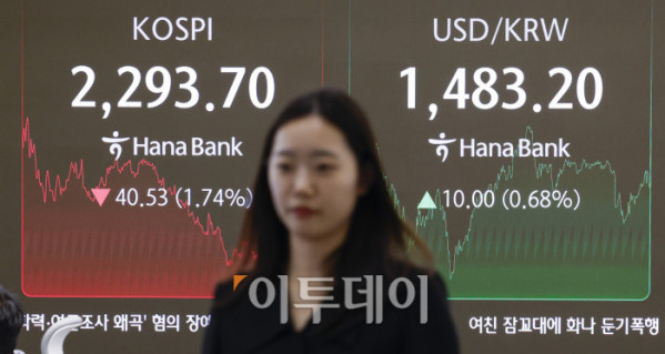 ▲미국의 상호관세 발효를 앞두고 코스피 지수가 2300선 아래로 급락한 9일 서울 중구 하나은행 딜링룸 전광판에 코스피가 표시돼 있다. 이날 코스피 지수는 전 거래일보다 40.53(1.74%)포인트 하락한 2293.70을 나타냈다. 코스피가 2300선 아래로 하락한 것은 2023년 11월 11일(2288.64) 이후 1년 5개월여 만이다. 조현호 기자 hyunho@