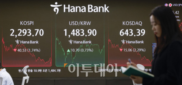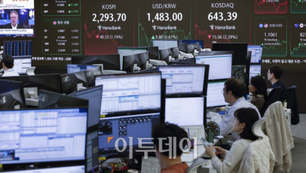▲미국의 상호관세 발효를 앞두고 코스피 지수가 2300선 아래로 급락한 9일 서울 중구 하나은행 딜링룸 전광판에 코스피, 원·달러 환율이 표시돼 있다. 이날 코스피 지수는 전 거래일보다 40.53(1.74%)포인트 하락한 2293.70을 나타냈다. 코스피가 2300선 아래로 하락한 것은 2023년 11월 11일(2288.64) 이후 1년 5개월여 만이다. 이날 원·달러 환율은 종가 기준 1483.20원을 나타냈다. 조현호 기자 hyunho@