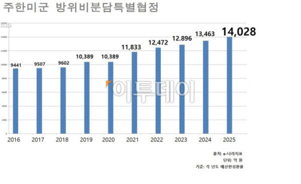 한 해 국방예산이 61조6000억 원 수준인 가운데 주한미군 방위비로 1조4028억 원에 합의한 셈이다. 국방예산의 2.27% 수준이다.