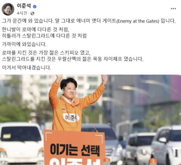 이 예비후보는 이날 페이스북에 “그가 문간에 와 있다. 말 그대로 에너미 앳더 게이트(Enemy at the Gates)다”라면서 “한니발이 로마에 다다른 것처럼, 히틀러가 스탈린그라드에 다다른 것처럼 가까이에 와 있다”고 했다. 고대 카르타고 명장 한니발과 2차 대전의 독재자 히틀러를 통해 이 대표를 로마와 소련에 위협을 가했던 ‘침공자’로 비유한 것이다.
