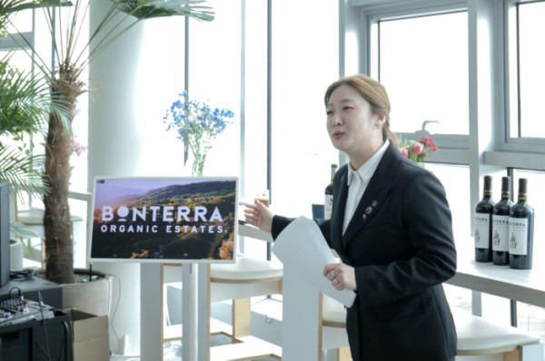 ▲이소리 소믈리에가 9일 서울 서초구 반포동 와인바 무드서울에서 미국 유기농 와인 브랜드 본테라에 대해 설명하고 있다. (사진제공=아영FBC)