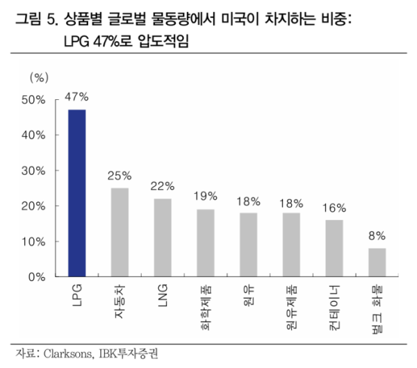 오지훈 IBK투자증권 연구원은 "글로벌 물동량에서 미국의 비중은 벌크선(Bulk), 액화천연가스(LNG), 컨테이너(Container)는 8~22%인데 비해서 액화석유가스(LPG)와 에탄은 각각 47%, 100%에 달한다"며 "LPGc(LPG 운반선)과 VLEC(에탄 운반선)의 가스선에서 한국 조선업의 대폭적인 수혜가 발생하는데 시장에서는 아직 여기에 주목하고 있지는 않다"고 짚었다.