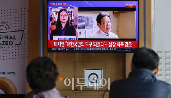 이재명 더불어민주당 전 대표가 영상을 통해 대선 출마를 선언한 10일 서울 용산구 서울역 대합실에서 시민들이 이 전 대표의 제21대 대통령 선거 출마 선언 관련 뉴스를 시청하고 있다. 이 전 대표는 이날 다큐멘터리 형식의 10분 분량 영상을 통해 대선 출마 선언을 했다. 조현호 기자 hyunho@