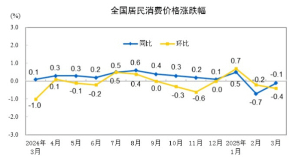 ▲중국 소비자물가지수 추이. 3월 전년 대비 0.1% 하락, 전월 대비 0.4% 하락. 출처 중국 국가통계국