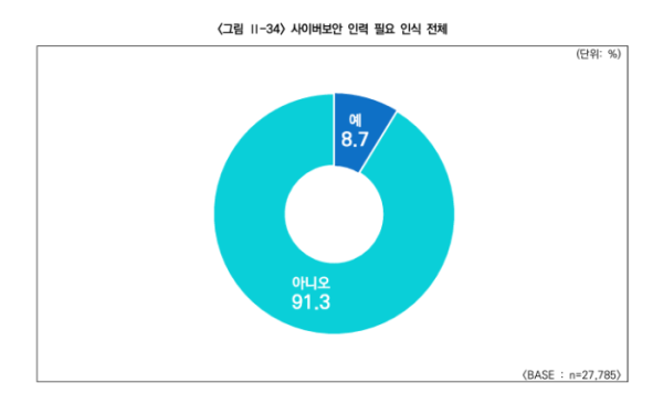 10일 과학기술정보통신부와 한국정보보호산업협회(KISIA)가 발간한 '2024년 사이버보안 인력수급 실태조사'에 따르면, 조사 대상 기업 중 사이버보안 인력이 "필요하다"고 응답한 비율은 8.7%에 불과했다. 나머지 91.3%는 인력이 필요 없다고 답했다. 이번 조사는 종사자 50인 이상이면서 컴퓨터를 1대 이상 보유한 민간 기업 2만7785곳을 대상으로 진행됐다.