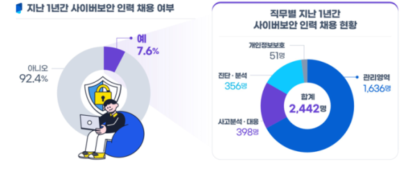 보안 인력 부족을 느끼는 기업도 채용에는 소극적이다. 최근 1년간 보안 인력을 채용한 기업은 전체의 7.6%에 불과했다. 향후 1년 내로 채용계획이 있다고 응답한 기업도 33.2%에 그쳤다. 채용하지 않으려는 이유는 '자체 인력으로 해결 가능한 범위'(48.8%)를 꼽았다. 또한, '적합한 수준의 보안 인력 채용이 어려움'의 응답률은 23.8%, '예산 제약으로 인한 새로운 인력 채용 제한'의 응답률은 21.6%로 집계됐다.
