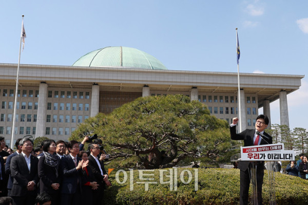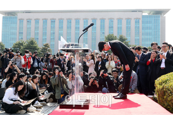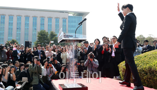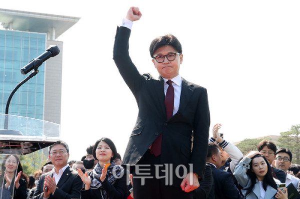 ▲한동훈 전 국민의힘 대표가 10일 서울 여의도 국회 분수대 앞에서 대선 출마 선언을 마치고 인사하고 있다. 고이란 기자 photoeran@