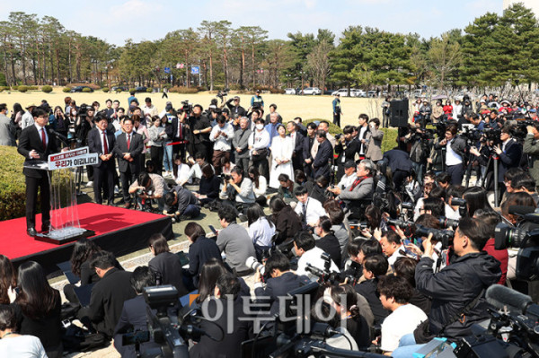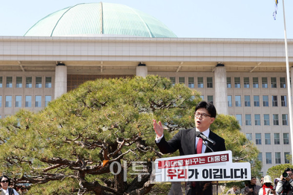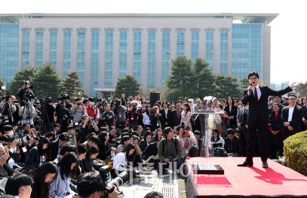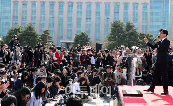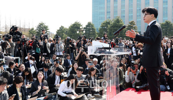 ▲한동훈 전 국민의힘 대표가 10일 서울 여의도 국회 분수대 앞에서 대선 출마 선언을 하고 있다. 고이란 기자 photoeran@
