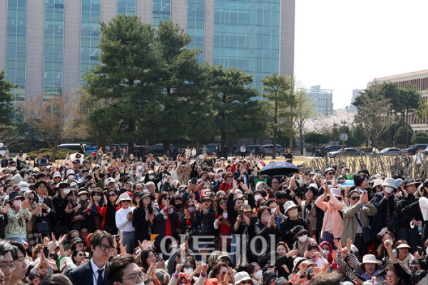 ▲지지자들이 10일 서울 여의도 국회 분수대 앞에서 한동훈 전 국민의힘 대표의 대선 출마 선언을 보며 환호하고 있다. 고이란 기자 photoeran@
