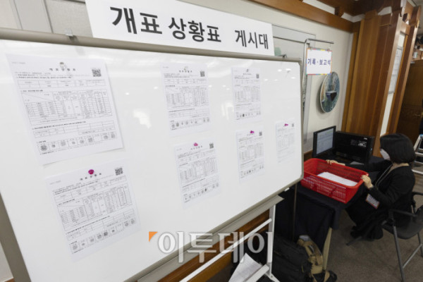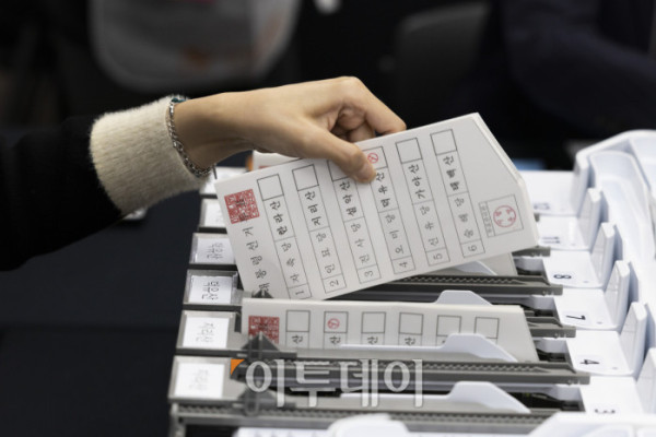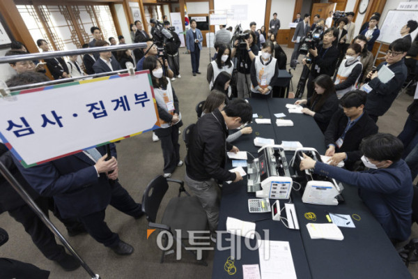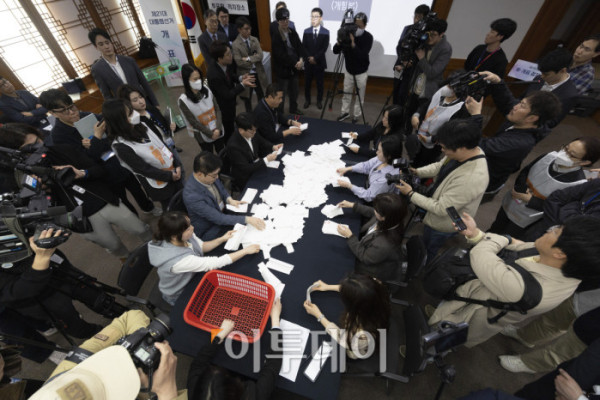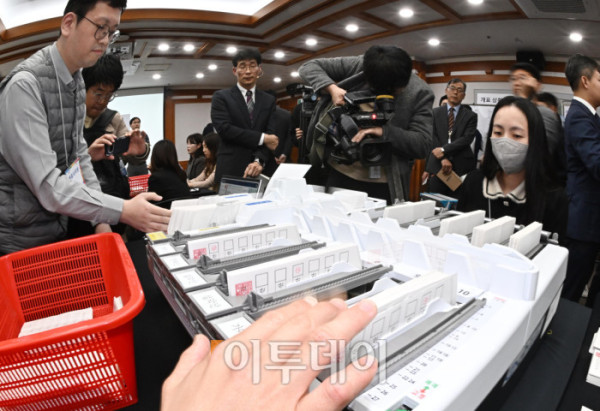 ▲10일 오후 경기도 과천시 중앙선거관리위원회에서 열린 제21대 대통령 선거 투·개표 절차 시연회에서 선관위 직원들이 관외사전투표지를 꺼내 확인하고 있다. 조현호 기자 hyunho@