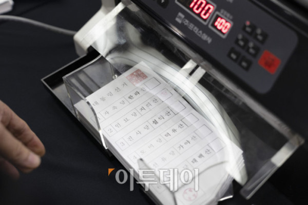 ▲10일 오후 경기도 과천시 중앙선거관리위원회에서 열린 제21대 대통령 선거 투·개표 절차 시연회에서 투표지 분리기를 통과한 투표지를 꺼내고 있다. 조현호 기자 hyunho@