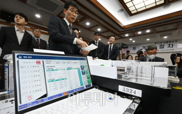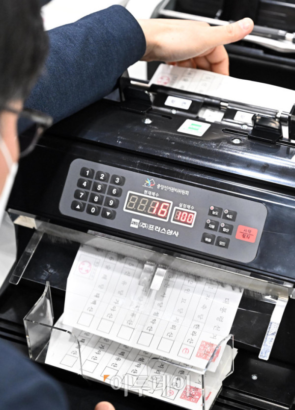 ▲10일 오후 경기도 과천시 중앙선거관리위원회에서 열린 제21대 대통령 선거 투·개표 절차 시연회에서 선관위 직원들이 투표지 분리기로 시연을 하고 있다. 조현호 기자 hyunho@