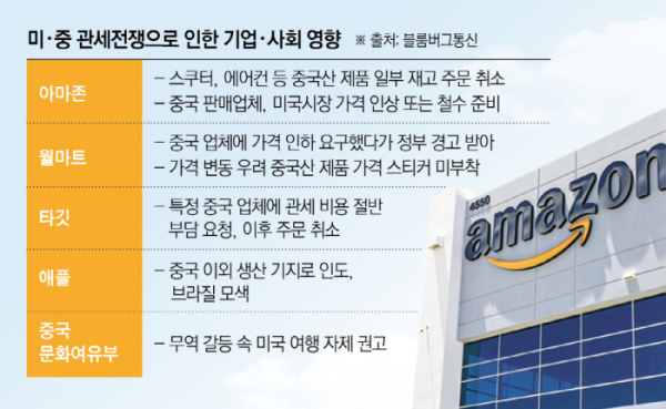 주요 2개국(G2)의 고래 싸움이 끝날 줄 모르는 분위기로 접어들면서 기업과 양국 국민은 벌써 충격파를 피부로 느끼고 있다고 블룸버그는 지적했다. 미국 전자상거래업체 아마존은 최근 중국과 아시아 국가에서 생산된 여러 제품에 대한 주문을 취소했다. 소식통에 따르면 2일 트럼프 대통령의 상호관세 부과 발표 이후 비치 의자, 스쿠터, 에어컨 등 여러 상품 주문이 중단됐다. 예고 없이 주문이 취소된 시점을 둘러싸고 거래업체들 사이에서는 트럼프 행정부의 관세로 인한 타격을 줄이기 위한 대응이라는 관측이 제기됐다.