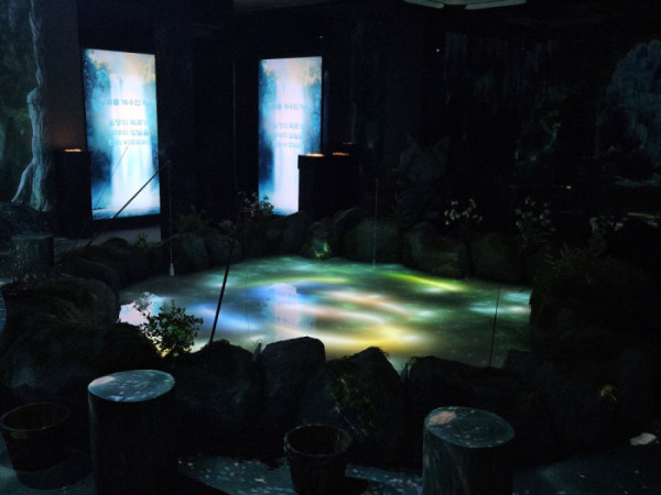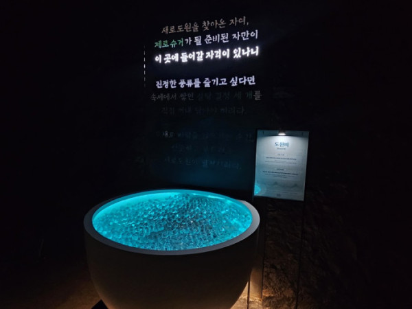 직원의 안내에 따라 들어간 ‘도원비’에서는 푸른색 복주머니을 받은 뒤 한 바구니에 담긴 동그란 흰색 결정체 3개를 집어 들어야 했다. 동그랗고 투명한 흰색 결정체의 정체는 설탕을 형상화한 구슬이다. 다음으로 어두컴컴한 곳에 조성된 ‘소원 연못’은 푸른 조명을 통해 몽환적인 분위기를 연출했다. 이곳에선 자석 낚시로 오늘의 운세를 뽑아볼 수 있는데, ‘매번 인연의 문 앞에서 기회를 놓쳤다면 이제부터 특별한 주의를 기울여 보라’는 문구로 웃음을 자아냈다.