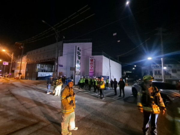 11일 오전 경기 광명시 일직동 신안산선 환기구 공사구간 구조물 손상으로 인한 현장 붕괴 위험으로 주변 도로가 통제되고 있다.