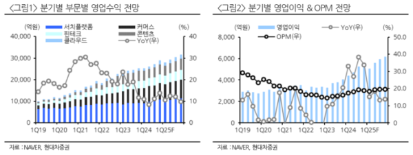 더불어 "1분기 서치플랫폼 매출은 전년 대비 8.6% 증가할 것으로 예상하며, 검색이 7.2%, 디스플레이가 13.3% 각각 성장할 전망"이라며 "피드형 확대에 따른 지면 증가로 시장 초과성장은 당분간 지속할 것으로 기대되는 한편, 3월 말부터 시범적으로 도입된 인공지능(AI) 브리핑 서비스가 시장에 안착하는 경우, 소비형 검색시장에서 더욱 확고한 지위를 구축할 것으로 기대된다"라고 설명했다.