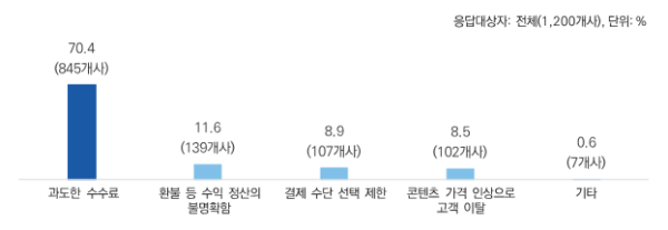 앱 내 결제(인앱 결제)의 가장 큰 문제점은 ‘과도한 수수료’라고 답한 앱 개발자가 70.4%로 가장 높게 나타났으며, 다음으로 ‘환불 등 수익 정산의 불명확함’ (11.6%), ‘결제 수단 선택 제한’(8.9%) 순으로 조사됐다.