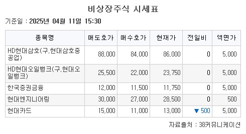 희토류 영구자석 생산기업 성림첨단산업은 3만1500원(-1.56%)으로, 신용카드 및 할부금융사 현대카드는 호가 1만3000원(-3.70%)으로 하락했다.