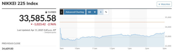 트럼프 미국 행정부의 관세 정책과 미ㆍ중 무역마찰에 대한 우려 탓에 미국 증시가 대폭 하락한 흐름이 일본에서도 이어진 것으로 분석된다.