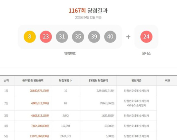 제1167회 동행복권 로또 추첨 결과 '8, 23, 31, 35, 39, 40'이 1등 번호로 결정됐다. 2등 보너스 번호는 '24'다.
