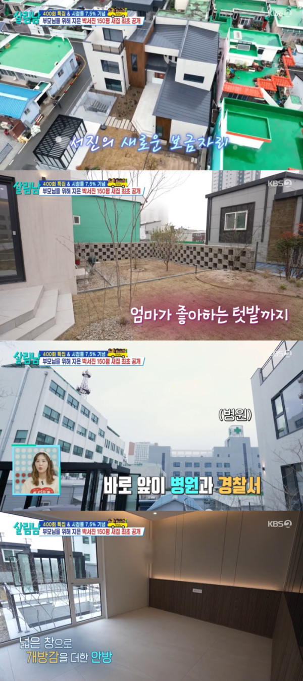 이후에는 부모님을 위해 직접 설계한 150평대 새집을 공개했다. 주차장으로 꾸려진 1층을 지나자 바비큐존과 텃밭을 품은 마당과 본격적인 저택이 등장해 놀라움을 안겼다.