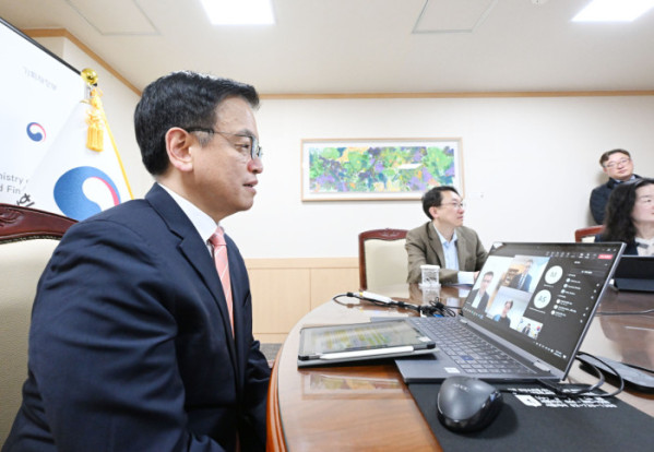 ▲최상목 부총리 겸 기획재정부 장관이 11일 서울 종로구 정부서울청사에서 짐 차머스 호주 재무장관과 화상면담을 하고 있다. (기획재정부)