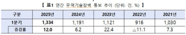 1분기 무역기술장벽(TBT·Technical Barriers to Trade)이 분기 기준 역대 최대치를 기록하며, 우리 수출 기업의 부담이 커진 것으로 나타났다. 특히 미국과 중국, 유럽연합(EU) 등 우리 한국의 주요 3대 수출 시장에서의 규제가 20% 이상 급증해 우려를 키웠다. 정부는 양·다자간 협상 등 모든 수단을 총동원해 기업의 TBT 애로를 적극 해소하겠다는 방침이다.