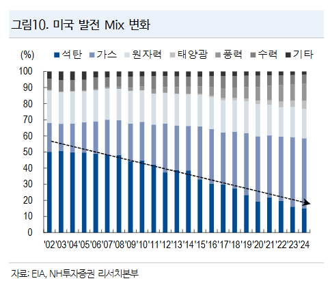 정연우 NH투자증권 연구원은 "지난 수년간 재생에너지 발전원이 발전 단가가 가장 저렴한 구간에 진입했다"라며 "미국 내에서는 상대적으로 발전 단가가 저렴하고 온실가스 배출량이 적은 가스 발전이 석탄 발전을 지속해서 대체되는 중"이라며 이같이 분석했다.