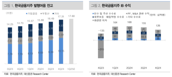 박혜진 대신증권 연구원은 "한국금융지주의 1분기 순이익은 컨센서스를 5.2% 웃돌 것으로 전망한다"라며 "회사 강점인 투자은행(IB), 프로젝트 파이낸싱(PF) 영업을 여전히 적극적으로 하고 있고, 금리 하락에 따라 채권도 적극적으로 운용한 것으로 파악된다"라고 설명했다.