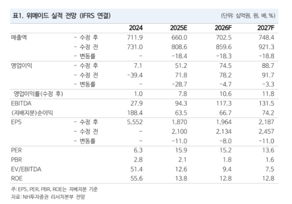 안재민 NH투자증권 연구원은 “위메이드의 연결 기준 올해 매출을 기존 8086억 원에서 6600억 원으로, 영업이익을 718억 원에서 512억 원으로 각각 18.4%, 28.7% 하향 조정한다”고 말했다.