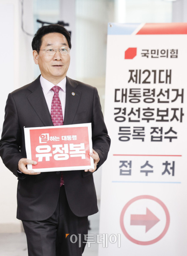 국민의힘 제21대 대통령 선거 경선후보자 등록 접수가 시작된 14일 서울 영등포구 국민의힘 중앙당사에서 유정복 인천시장이 후보자 접수를 위해 접수처에 들어서고 있다. 국민의힘 경선 선거관리위원회는 이날부터 15일까지 이틀간 대선 경선 후보자 등록 신청을 받는다. 조현호 기자 hyunho@