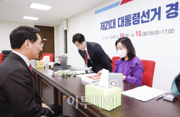 ▲국민의힘 제21대 대통령 선거 경선후보자 등록 접수가 시작된 14일 서울 영등포구 국민의힘 중앙당사에서 유정복 인천시장이 후보자 접수를 위해 접수처에 들어서고 있다. 국민의힘 경선 선거관리위원회는 이날부터 15일까지 이틀간 대선 경선 후보자 등록 신청을 받는다. 조현호 기자 hyunho@