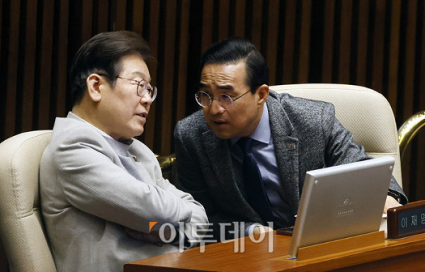 ▲이재명(왼쪽) 전 더불어민주당 대표와 박홍근 의원이 14일 서울 여의도 국회 본회의에서 열린 정치·외교·통일·안보 분야 대정부질문에서 대화하고 있다. 고이란 기자 photoeran@