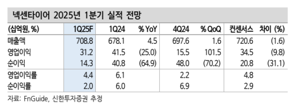 신한투자증권에 따르면 넥센타이어의 올해 1분기 매출액과 영업이익은 전년동기대비 각각 4.5% 증가, 25% 하락한 7088억 원과 312억 원으로 예상된다. 이는 시장 기대치인 매출액 7206억 원과 영업이익 345억 원을 하회하는 수치다.