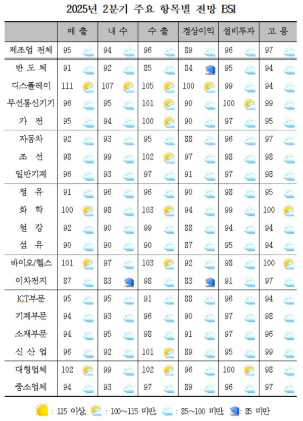 ▲2025년 2분기 주요 항목별 전망 BSI (자료제공=산업연구원)
