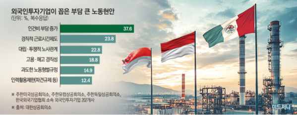 김종철 주한외국기업연합회 대표는 “외국 기업 이야기를 들어보면 남북대치 등 안보 문제와 노동 문제가 한국 공장 설립을 망설이게 하는 대표적 요인”이라면서 “중국, 베트남 등 경쟁 지역보다 임금이 높고 한국의 강한 노동법 준수 의무, 강성 노조도 언급되는 요인 중 하나”라고 짚었다.