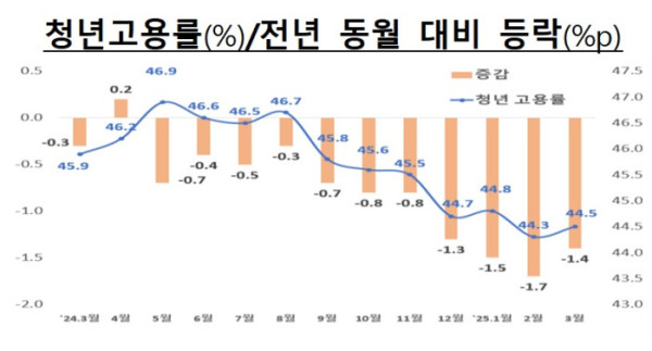고용노동부는 16일 김범석 기획재정부 1차관 주재로 열린 관계부처 합동 일자리전담반(TF) 회의에서 ‘청년 일자리 및 직접 일자리 사업 추진상황’을 발표했다. 고용부에 따르면, 지난달 청년(15~29세) 고용률은 전년 동월보다 1.4%포인트(p) 내리고, 실업률은 1.0%p 올랐다. 고용률은 지난해 5월 이후 11개월 연속 내림세다. 고용부는 최근 청년 고용난을 일자리 창출력 저하와 노동시장 이중구조 심화에 따른 ‘질 좋은’ 일자리 부족, 경기 불확실성 확대에 따른 기업들의 신규 채용 유보와 수시·경력 채용 선호가 복합적으로 작용한 결과로 보고 있다.
