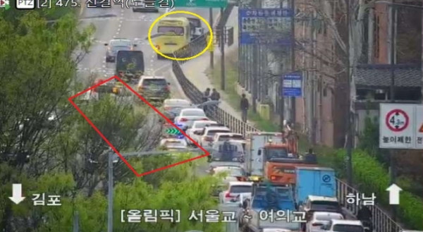 승용차 한 대가 옆으로 넘어지면서 사고 처리로 1차로가 차단돼 출근길 차량 정체가 이어지고 있다. 서울시 교통정보는 "1차로 사고 차량이 하위차로로 이동했으나, 1차로는 계속 차단 중"이라며 "사고 여파로 후미 정체되니 참고 바란다"고 안내했다.