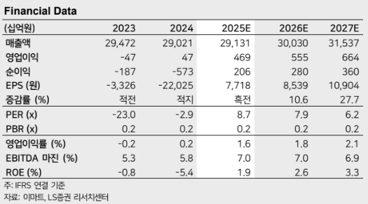 그는 “연결 자회사 또한 최악은 지난 상황으로 판단한다”며 “이마트는 밸류업 계획으로 2027년까지 매출액 34조 원과 영업이익 1조 원 목표를 제시한 바 있다”고 했다.