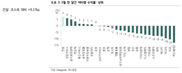 해외플랜트는 급격한 유가 하락으로, 발주가 악화됐다. 김 연구원은 "삼성E&A는 삼성전자의 투자의 재개 여부가 매수 유무를 결정지을 수 있다. 시멘트는 출하 감소, 전기료 인상 등에 따른 실적 감소가 예상되어 관망 의견"이라고 덧붙였다.