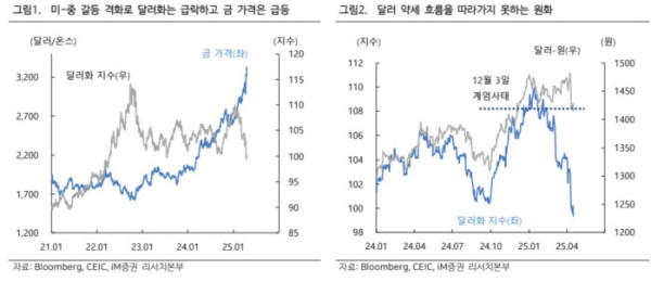 17일 iM증권은 "원화가 달러와 위안화 사이에 낀 형국"이라며 그 배경에는 "계엄 → 탄핵 → 조기 대선 등 6개월 가까이 이어지고 있는 국내 정치 불확실성, 미-중 갈등 격화에 따른 중국 경제 및 위안화 가치 불안 등이 있다"고 이같이 밝혔다.