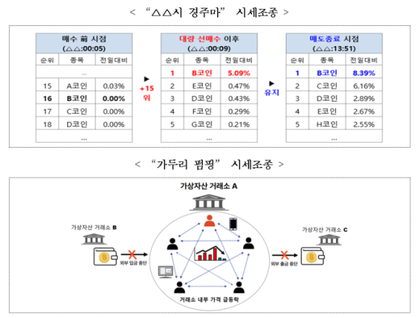 금융위에 따르면 혐의자는 특정 거래소에서 가상자산의 가격 변동률이 일괄적으로 초기화되는 시점(△△시 정각)을 전후로 물량을 대량 선(先)매집해 투자자들의 관심을 유도했다. 혐의자는 20∼30분내외 짧은 시간 동안 시세조종 주문을 초당 1~2회 집중·반복해 매수세가 지속적으로 유입되는 외관을 형성하는 방식으로 시세를 조종했다.