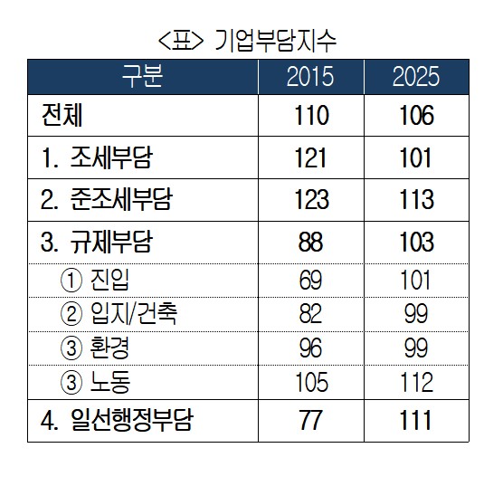 반면 규제 부담(88.3→102.9)은 10년 전과 비교하면 크게 높아졌다. 노동규제(112.0), 진입규제(101.1), 환경규제(99.3), 입지·건축규제(99.2) 등 모든 규제영역에서 부담이 증가한 것으로 나타났다.