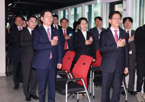 ▲17일 서울 여의도 국민의힘 중앙당사에서 열린 제21대 대통령선거 국민의힘 1차 경선 토론회 미디어데이에서 경선후보인 안철수(도착순서) 의원, 김문수 전 고용노동부 장관, 유정복 인천시장, 이철우 경북도지사, 나경원 의원, 양향자 전 의원, 한동훈 전 대표, 홍준표 전 대구시장이 국민의례를 하고 있다. 신태현 기자 holjjak@