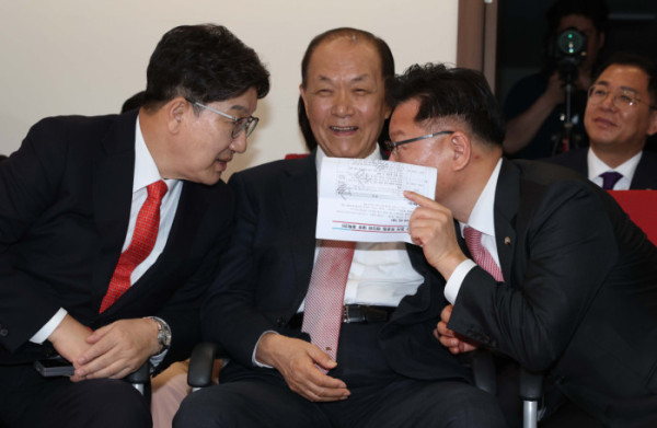 ▲제21대 대통령후보자 국민의힘 1차 경선 토론회 미디어데이가 17일 오전 서울 영등포구 여의도 중앙당사에서 열렸다. 권성동(왼쪽부터) 국민의힘 원내대표와 황우여 선관위원장, 이양수 사무총장이 대화하고 있다. 신태현 기자 holjjak@